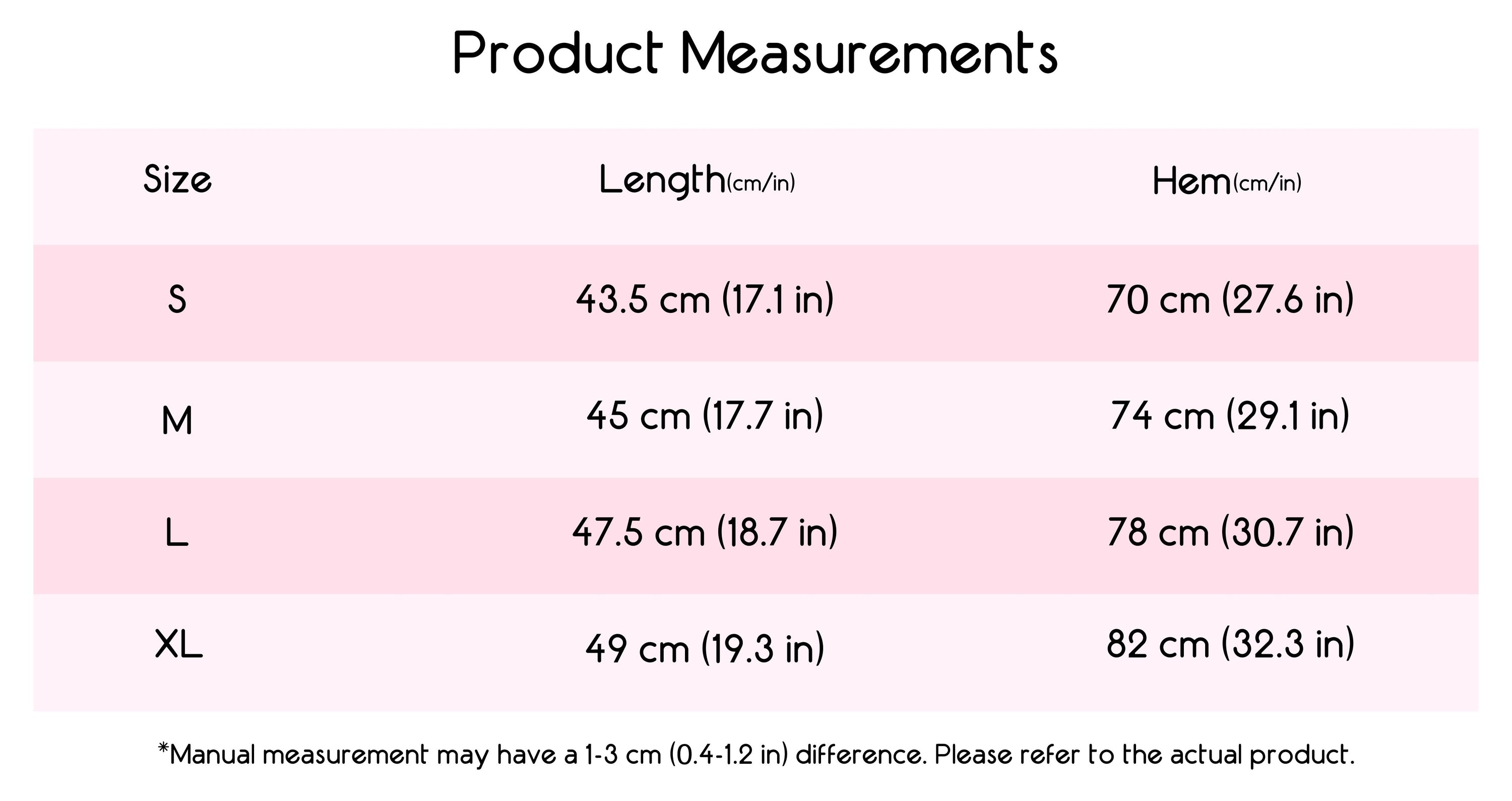 Kindly note that manual measurements may vary by 1–3 cm; the actual product shall prevail. If you are between sizes, we suggest choosing the larger size.