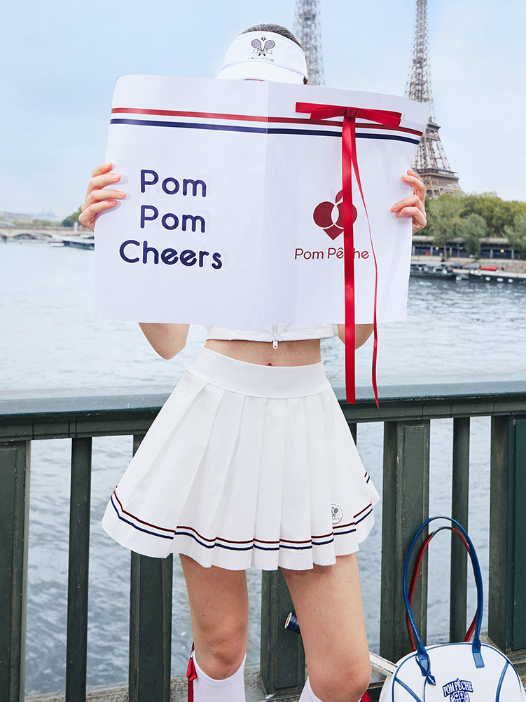 White knee-high tennis socks with black stripes, bow detail, and logo embroidery.