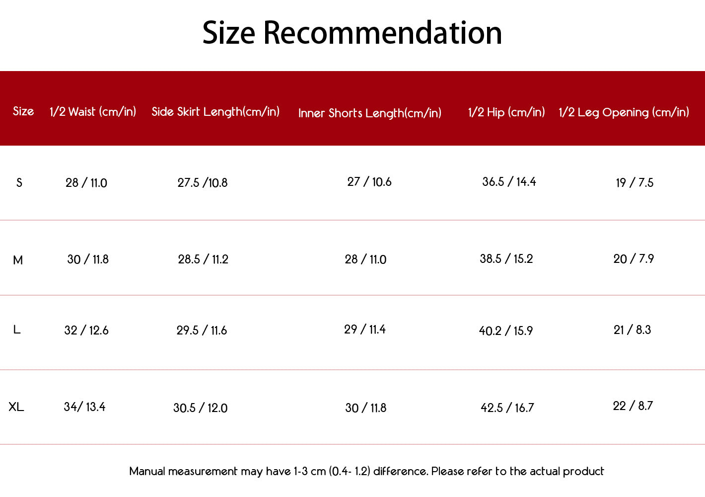 Kindly note that manual measurements may vary by 1–3 cm; the actual product shall prevail. If you are between sizes, we suggest choosing the larger size.
