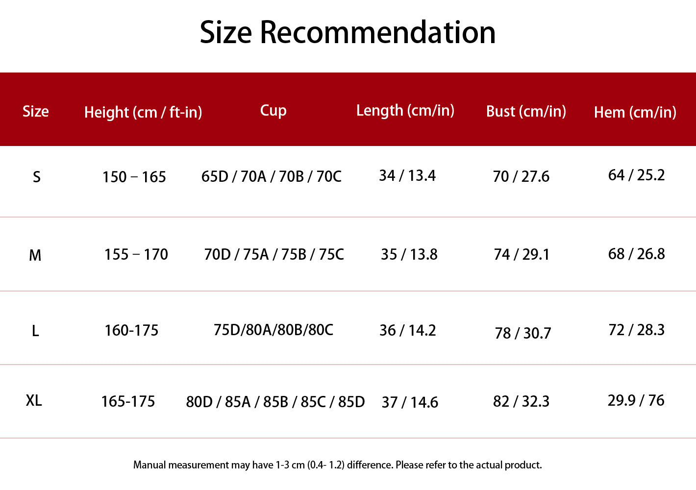 Kindly note that manual measurements may vary by 1–3 cm; the actual product shall prevail. If you are between sizes, we suggest choosing the larger size.